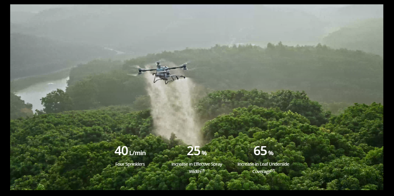 Designed for large-scale fieldwork, the T100 features a 100 L tank and dual atomising centrifugal nozzles, enabling faster flight speeds, broader spray coverage, and significantly improved operational efficiency. For orchard applications, an optional misting nozzle set enhances flow rates and atomization precision, allowing the spray to penetrate dense canopies and reach the undersides of tall, thick-leafed trees, ensuring adaptability and effectiveness across a wide range of agricultural environments.